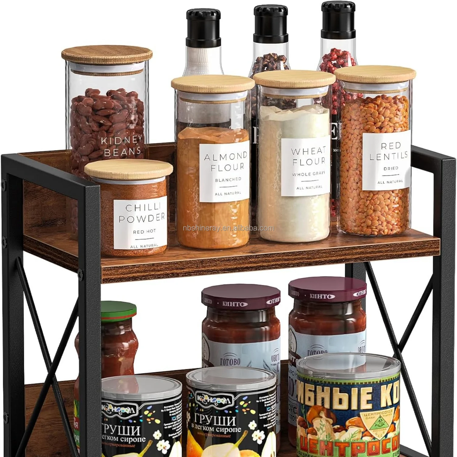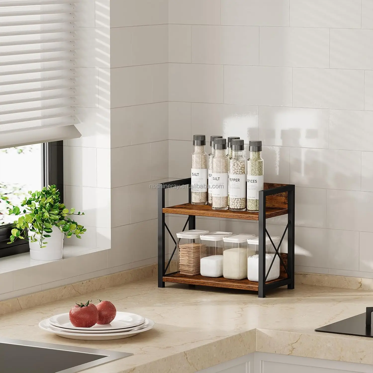 Double Tier Heavy Duty Brown Wood Multifunctional Kitchen Spice Rack & Coffee Counter Top Organizer with Standing Shelves